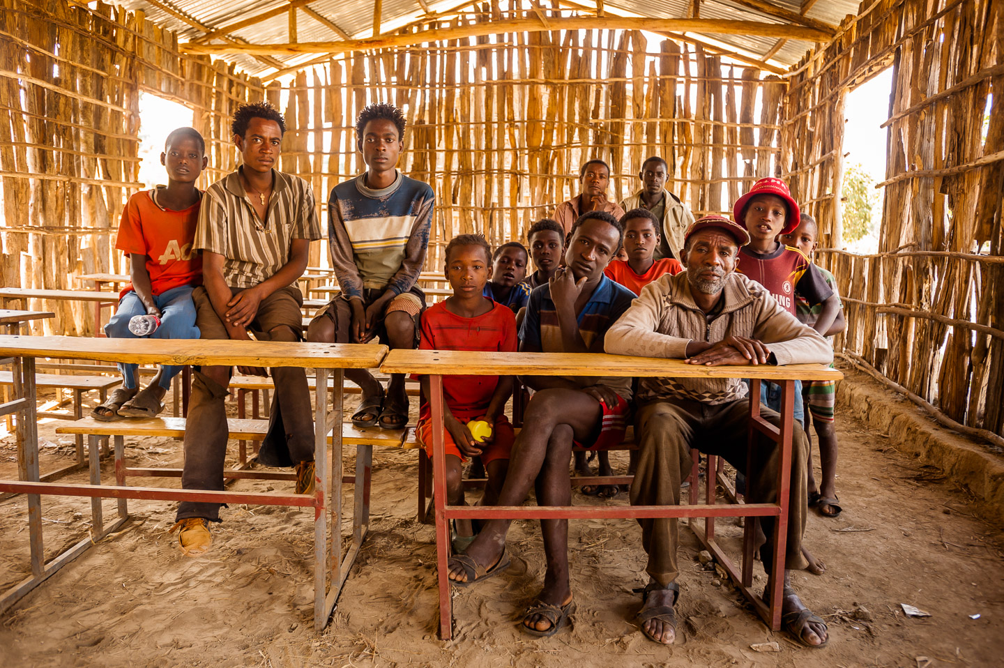 Villagers of Kuera Mukula gather in their local schoolhouse for a group portrait, displaying calm curiosity.